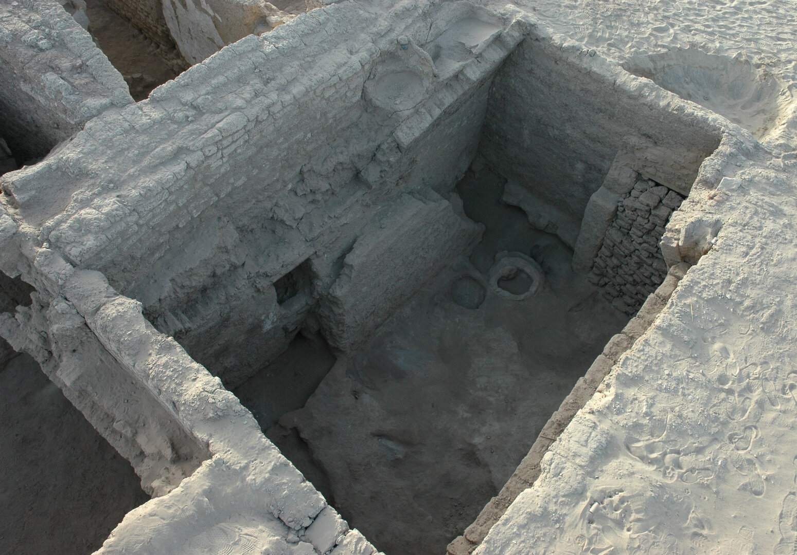 No evidence of a flat or vaulted roof was found, and it seems most plausible that B13 was conceived as an open space. A doorway placed at the northern end of the east wall (BF144; width between the protruding jambs: ca. 90 cm) leads to an unexcavated area to the east of the church complex. Another opening in the southeast corner of the courtyard, about 2.25 m wide, originally allowed passage into a north–south street (A34) partially excavated in the mid-1990s, which seems to have been the continuation of street B12 discussed above. At the opposite end of the south wall, a doorway (width: 1 m) opens onto an unexcavated room (A19) to the south. Two roughly rectangular basins were found at floor level to the sides of this doorway (Plate 4.27, Plate 4.28, Plate 4.29). To the east is the largest bin (BF147), measuring 0.93 m north–south by 2.03 m east–west and with an average height of 30 cm. The feature consists of an east–west partition wall of mud bricks and dressed stones, which is bonded, at its eastern end, with a shorter wall of mud bricks that runs north–south and abuts the south wall of B13, leaving the west side of the bin open. Both partition walls lie on top of a foundation layer of compacted mud dust and debris. Inside the bin are scanty traces of a floor of mud plaster, mixed with small potsherds and pebbles. The other bin (BF148), located 1.2 m to the west, is considerably smaller (52 cm north–south by 72 cm east–west). It was built by placing a low east–west partition wall, standing 20 cm above ground level, against the southeast corner of the south wall of corridor B11. The bin was open along its east side, where it faced the other bin.