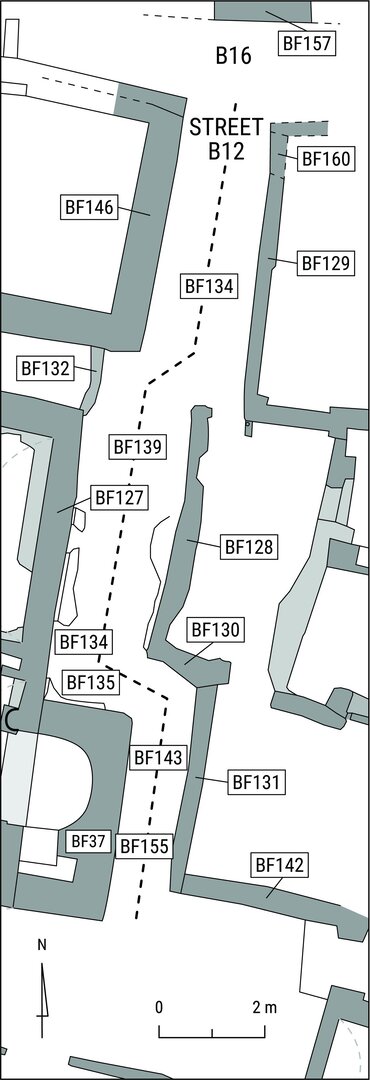The street has an irregular layout that results from the different construction phases of the buildings whose walls define its outline. Indeed, three different sectors, all running north–south and joined among them, can be identified. The northernmost measures ca. 4.80 m north–south by 1.80 m east–west and stretches from the eastern end of corridor B7 to another east–west passageway (B16) to the north. The west and east walls, relatively well preserved, separate this sector from unexcavated rooms, so that only their sides facing street B12 are known. The east wall consists in fact of a longer segment to the south (BF129) and a smaller addition (BF160) toward the north end, which rests on two foundation courses running also beneath the longer segment to the south. While the latter does not bear traces of mud plaster, the addition to the north is almost completely obscured by a thick layer. The west wall of the street’s north sector is BF146; it runs north–south and is perpendicular to BF76, the north boundary of room B7 (the corridor leading into the church complex).
