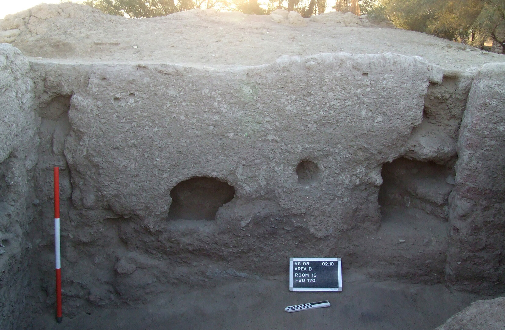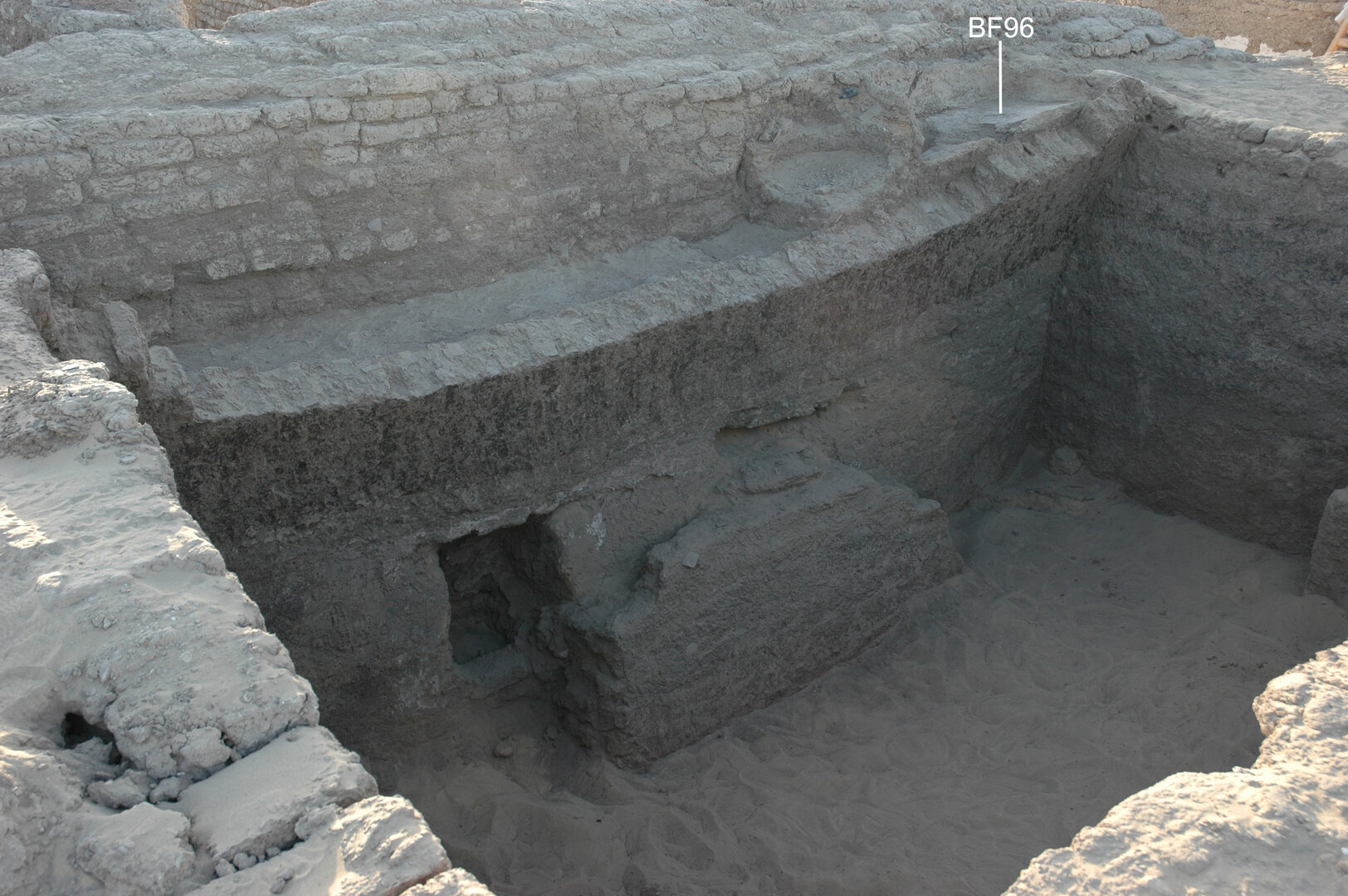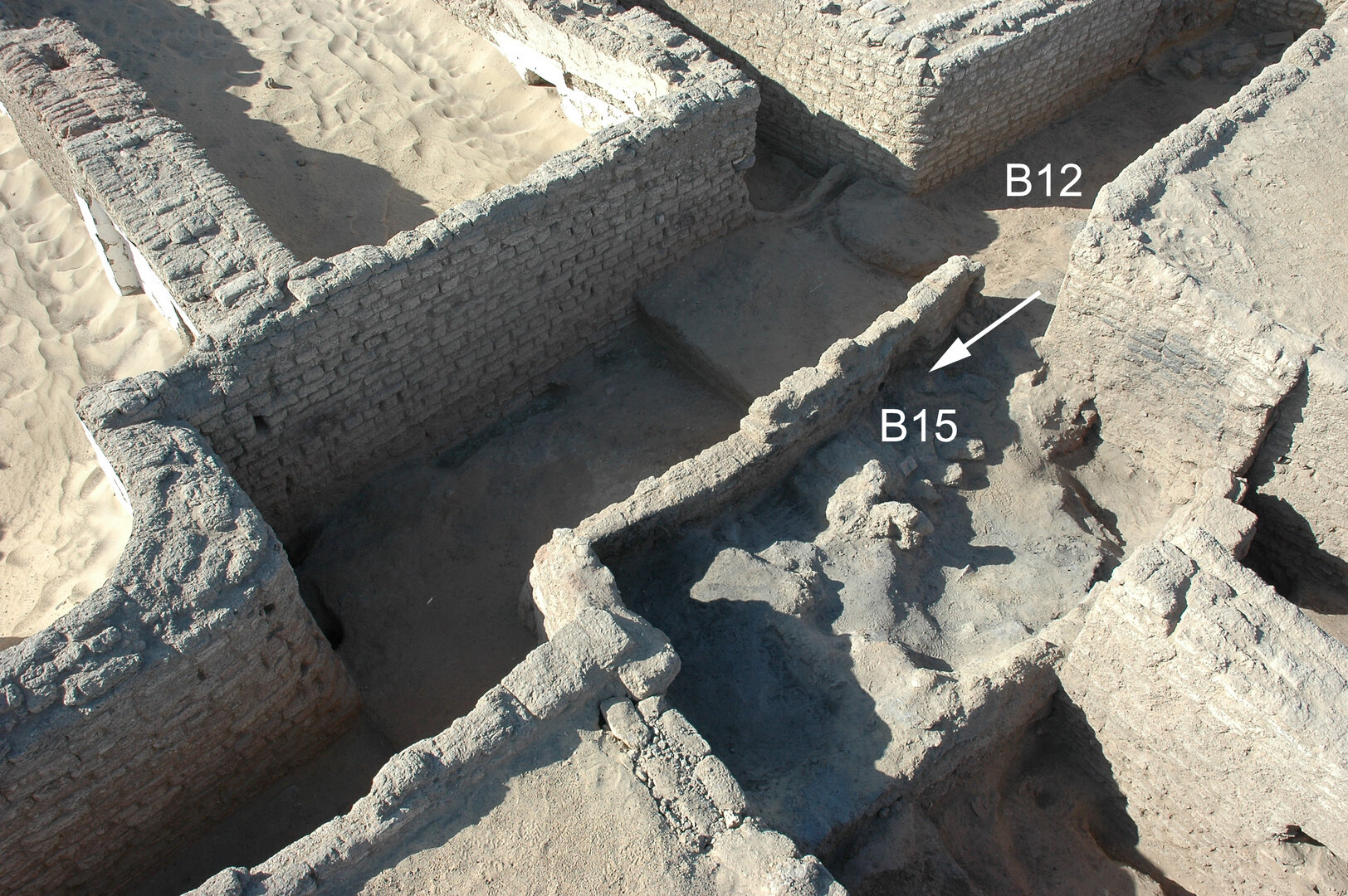 An arched niche is built within the south wall of the room, about 60 cm from its west end. It is 44 cm wide, 44 cm high, and 40 cm deep and has a semicircular band on top, recessed by ca. 4 cm. No traces of white gypsum plaster were found inside or around the niche, whose bottom part is heavily damaged and was likely the object of alterations already in antiquity. Another rectangular opening, ca. 80 cm wide and 70 cm high, was once set into the north wall of the room toward its eastern end, four courses above the latest floor level. At some point in antiquity, it lost its purpose and was completely bricked up (BF165). Room B14 possibly served, at least when it was roofed, as a storage facility for kitchen B15, before it was used, as mentioned above, as a domestic midden in its latest phase.