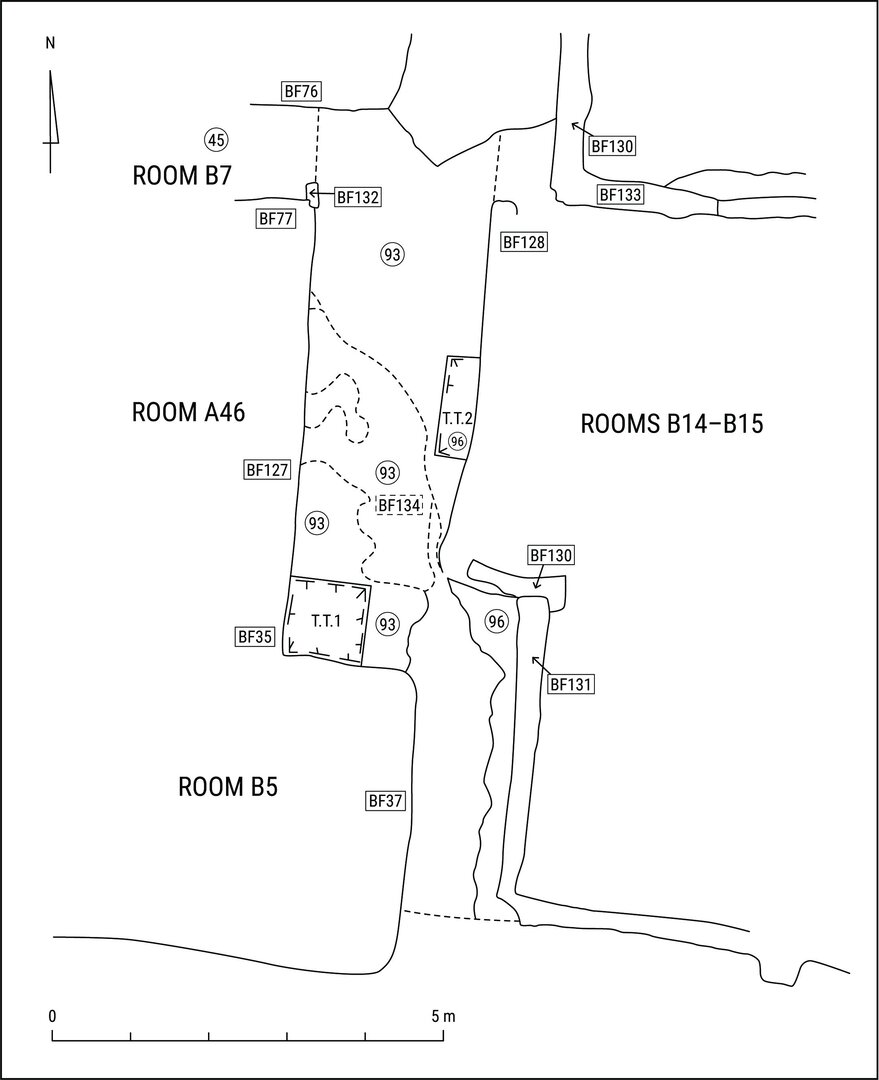 Evidence for the three floors consists of: a large section of an early floor level (BF118—upper elevation: 112.430 m) at the center of the room; scattered patches of a middle level (BF117—upper elevation: 112.500 m); and finally, the latest floor level of room B10 (BF111—upper elevation: 112.550 m), identified in the northern half and in the middle of the room.↩︎