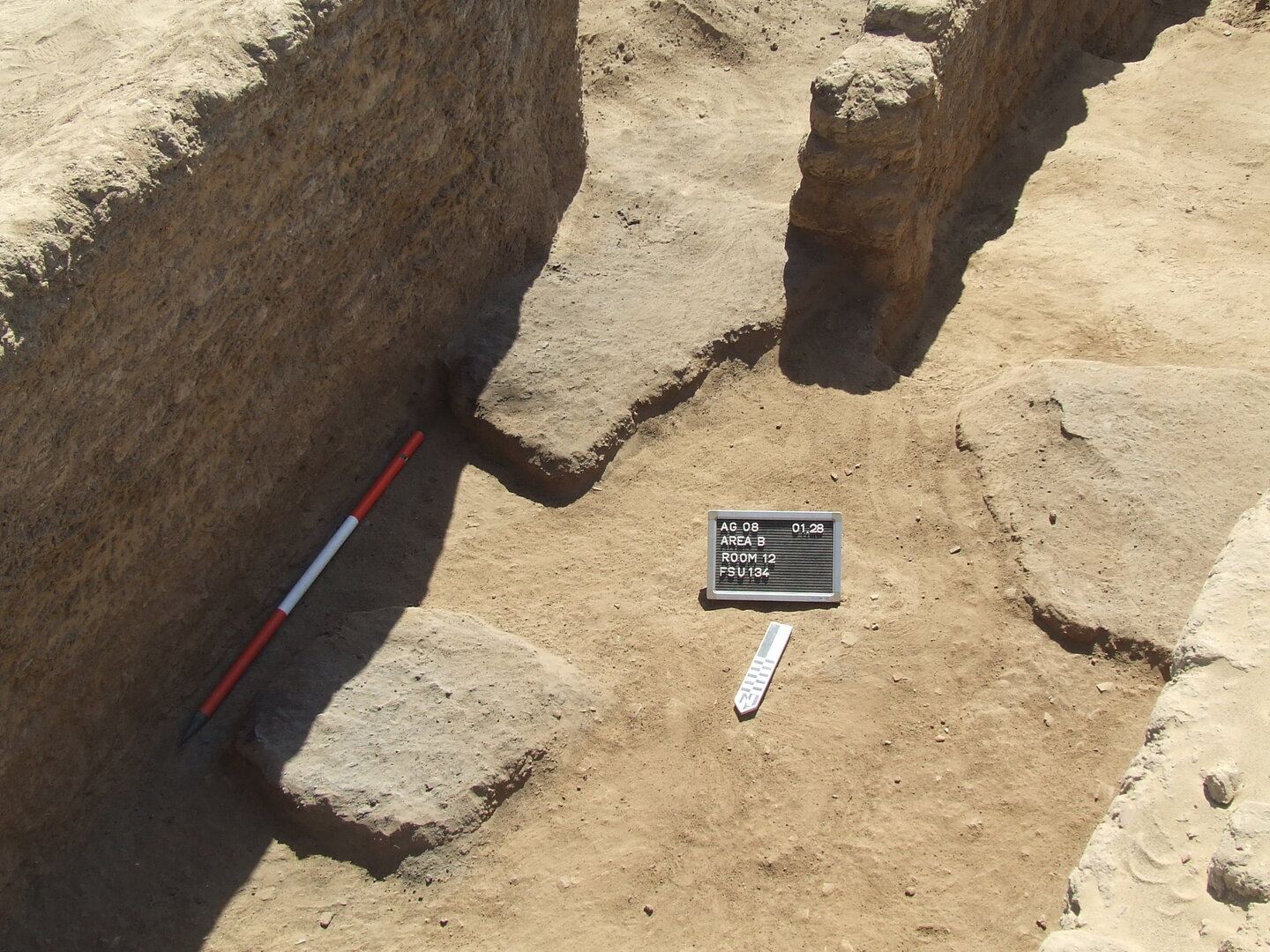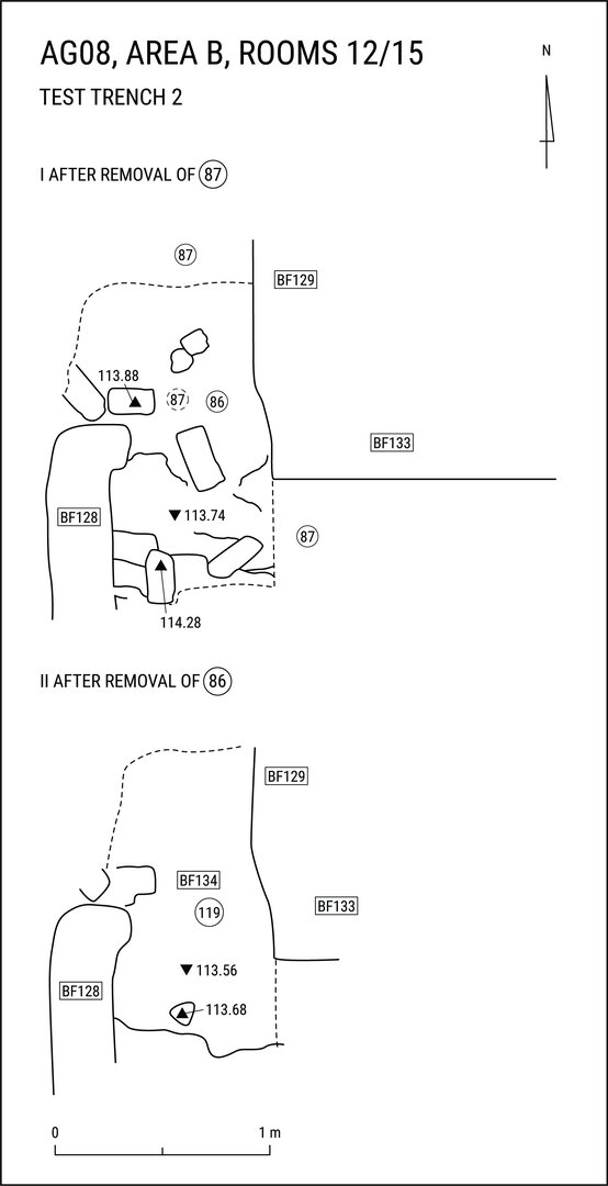 BF161 (upper elevation: 112.920 m) is the higher floor level, slightly sloping down eastwards. BF163 (upper elevation: 112.750 m) was exposed in a test trench dug in the western half of the room, along the east side of the doorway.↩︎