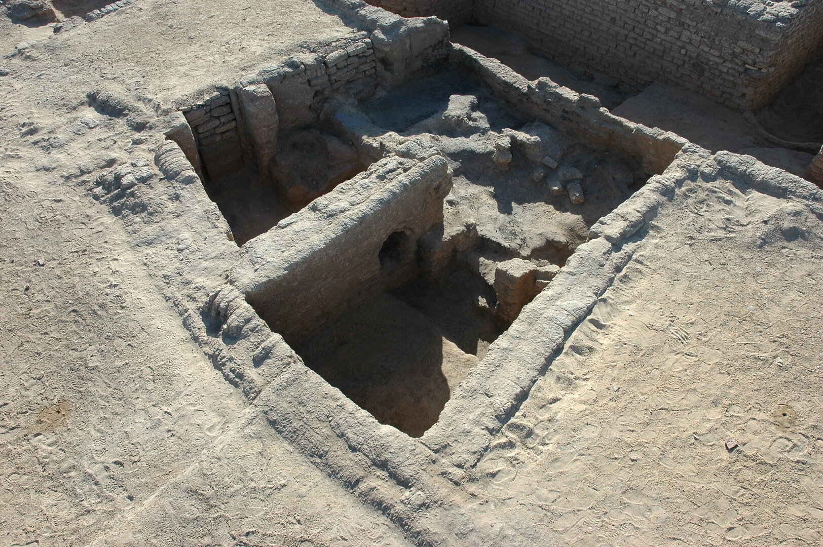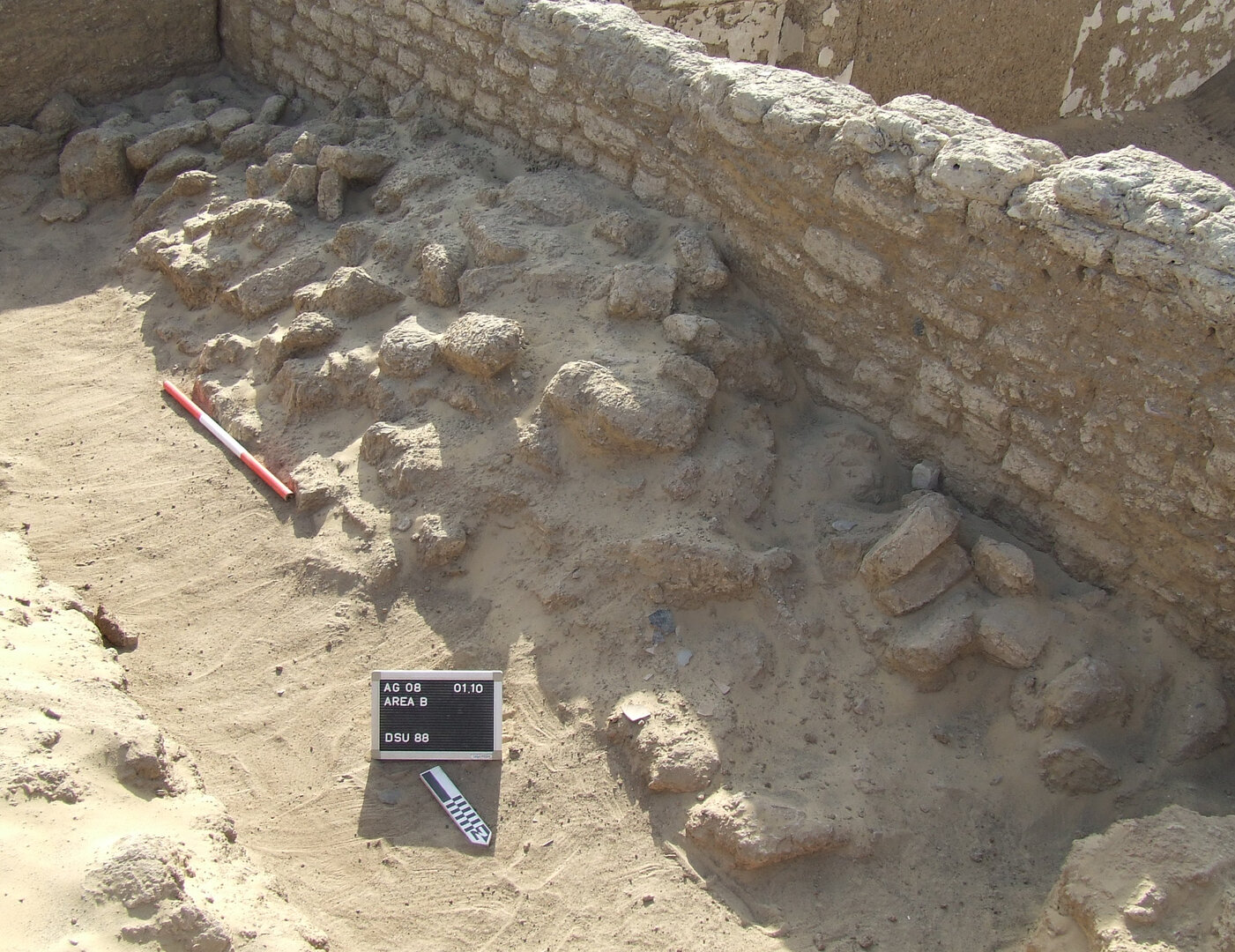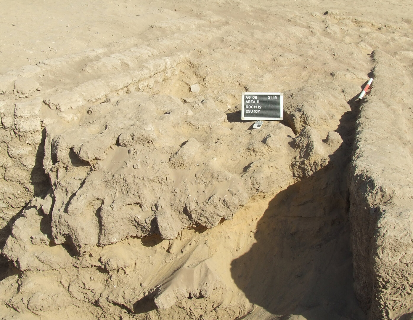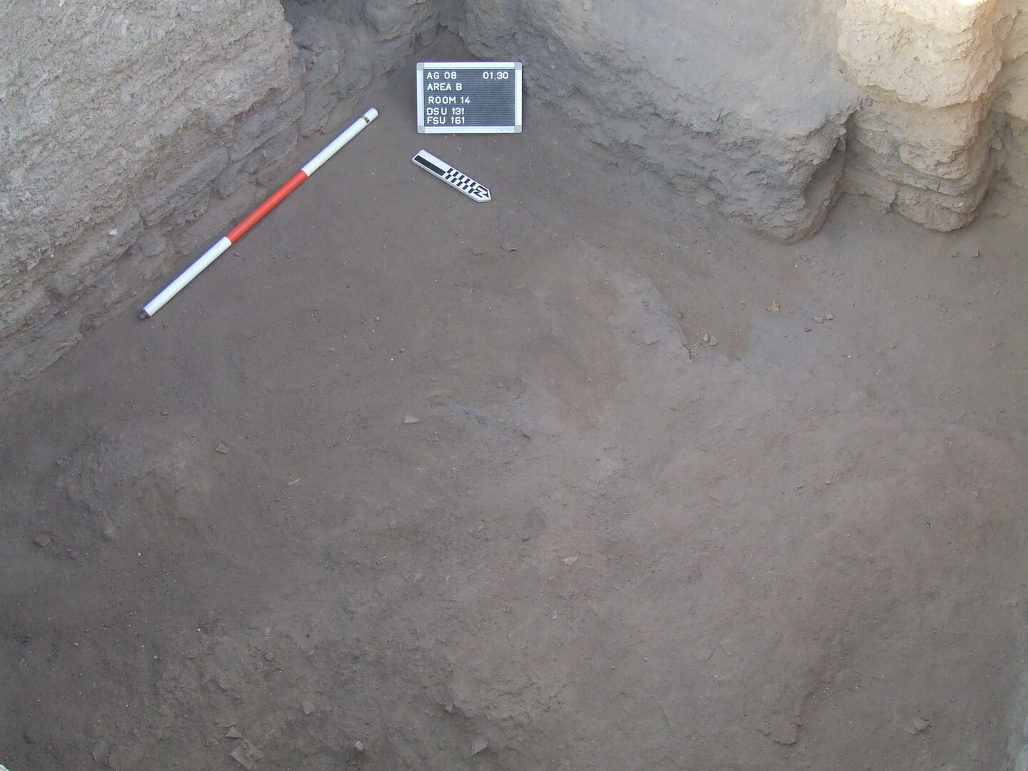 A test trench was dug along the original doorway into room B1497 and revealed DSU131,98 the preparation layer of the upper floor. DSU131, which consisted of sand and mud dust and included bones, other organic material, and pottery sherds (2.73 kg), rested on top of the earlier floor (Plate 4.43). This lay in turn on preparation layer DSU13399, which was made of sand and mud dust and mixed with several inclusions, among which were pebbles, lime spots, organic material, bronze fragments, and potsherds (0.73 kg). DSU133 lay directly above bedrock.