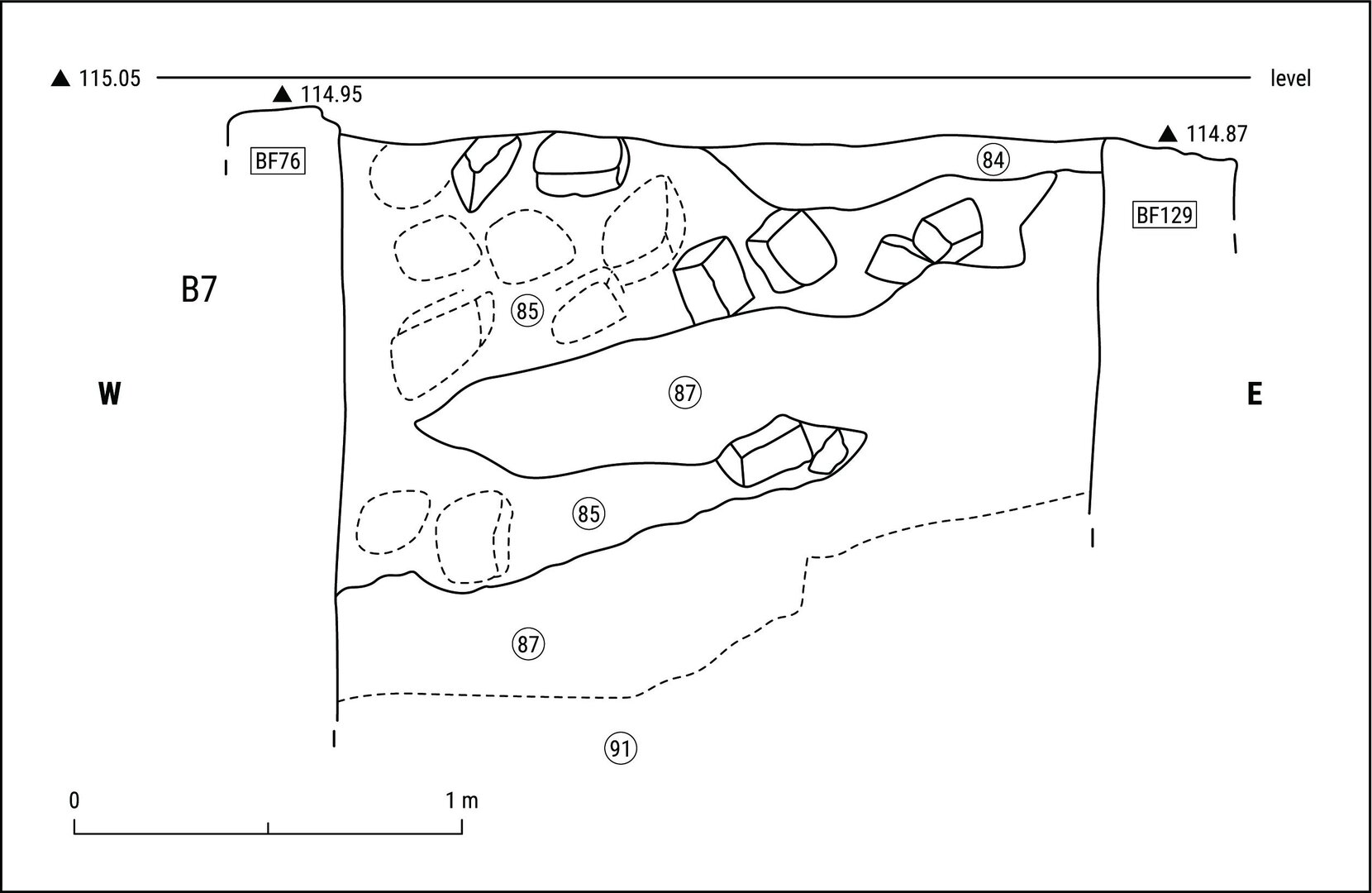 Upper elevation: 114.730 m; lower elevation: 113.820 m; max. thickness: 91 cm.↩︎