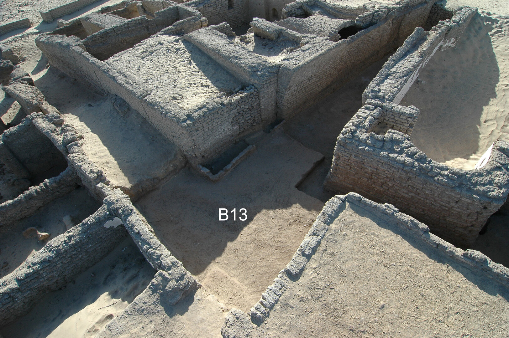 Room B10 went through several construction phases. The razed wall running from north to south was found below the earliest floor level and is therefore to be linked to an earlier building. The middle floor seems to have been used when the northern doorway was still open; after it was blocked, a third floor was laid, in phase with the three other doorways but preceding the damage that occurred to the east wall of the room and its restoration.