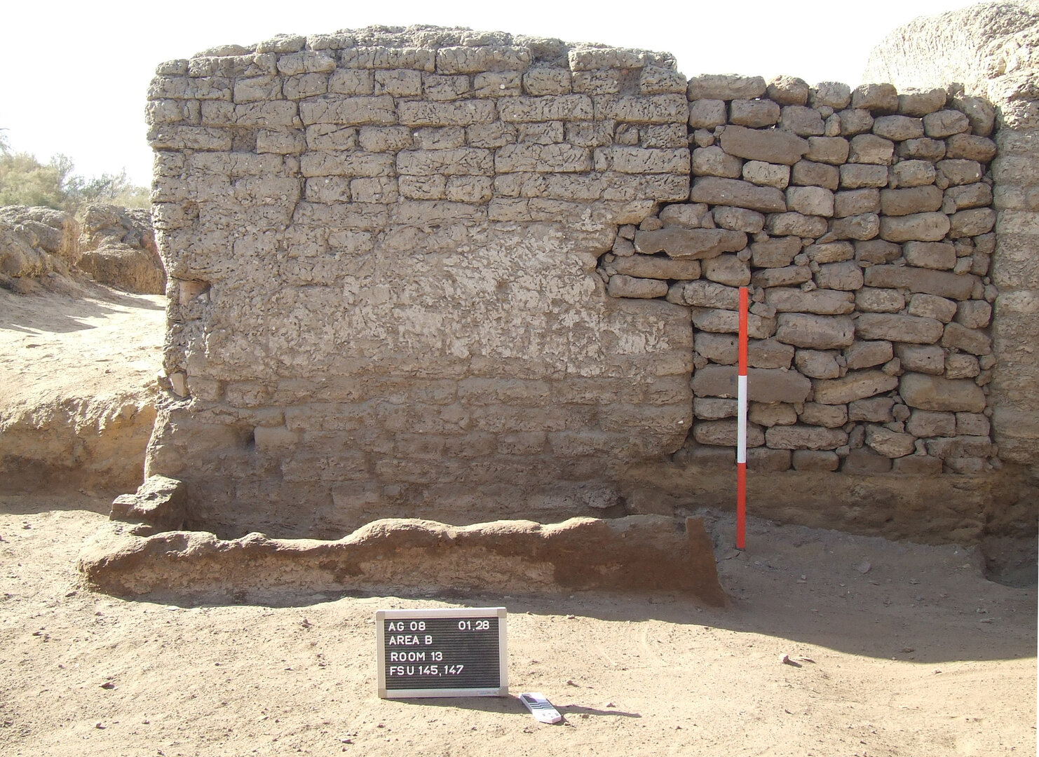 Two rectangular niches were originally set into the east wall. The southern one was bricked in at some point and almost completely hidden by the mud-brick buttress, apart from the stone lintel. The northern niche is still visible, at a height of ca. 80 cm above ground level.1 It is 52 cm wide, 57 cm high, and its depth is 48 cm; its bottom part was subject to heavy damage in antiquity and later restoration. The niche, as well as the wall, is covered by a thick layer of mud plaster; traces of a white gypsum band, ca. 30 cm thick, can be seen on both sides of the niche, although it is likely that it originally marked the upper and lower edges, too.
