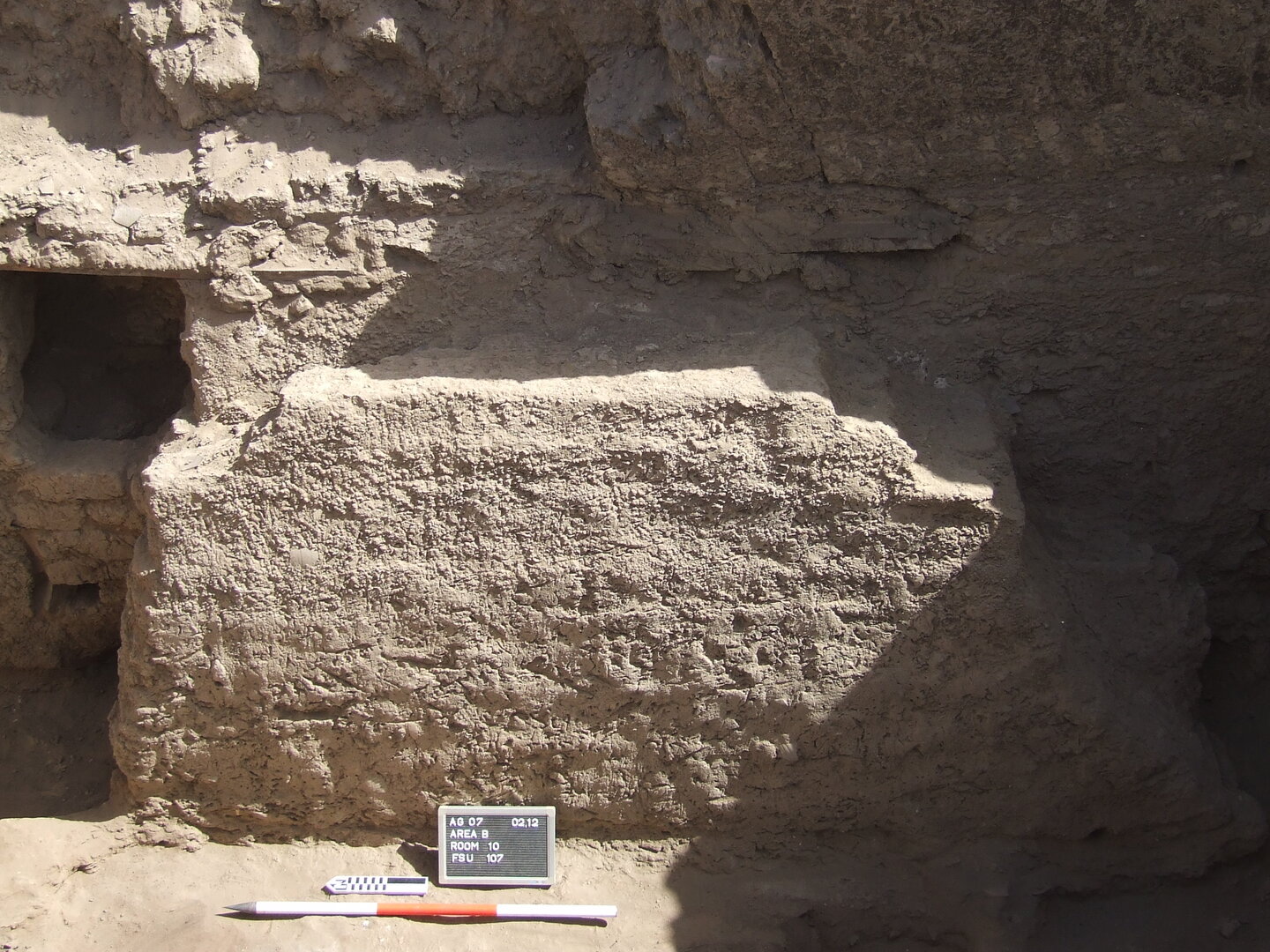 Considerable traces of ancient damage are visible especially along the east wall. Indeed, a roughly trapezoidal mud-brick buttress (BF107), measuring 3.03 m north–south by 0.35 m east–west, and standing to a maximum height of 1.40 m, was uncovered against it, likely built to support the wall after a rather poor restoration (Plate 4.3).