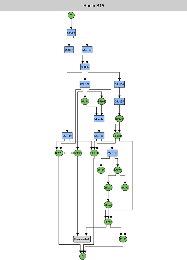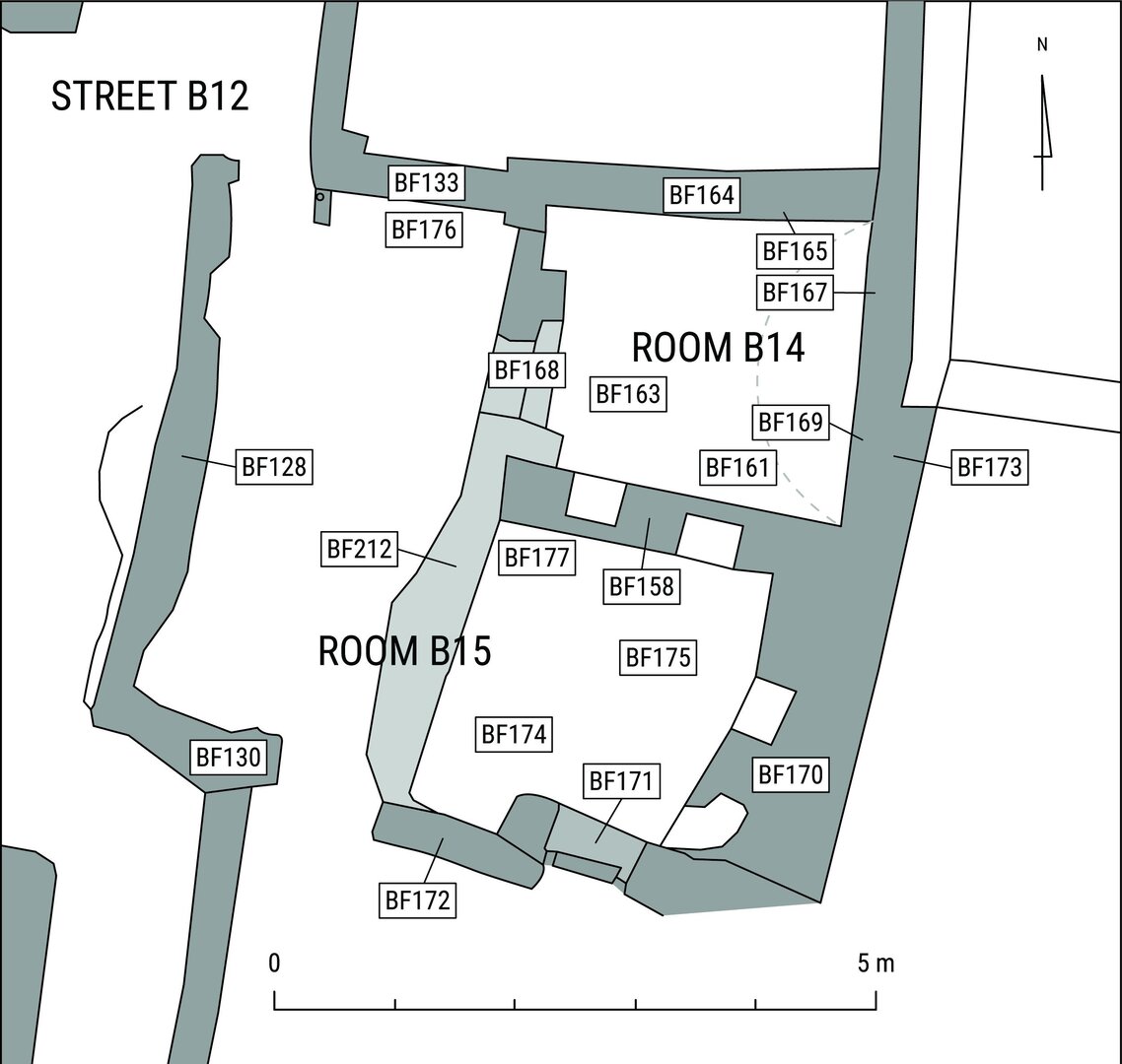 Besides the narrow doorway in the northwest corner of room B15, opening onto street B12, two other doorways once led onto an unexcavated space to the south.73 No evidence of any roof was found in situ or inside room B15; also, the presence of ovens suggests that it was an open-air space. Three floor levels (the highest, BF174;74 the middle, BF175, in phase with the doorway in the southeast corner of the room;75 and the lowest floor level, BF17776) are evidence of different occupational phases. The stratigraphical contexts identified within room B15 suggest that at some point the ovens were no longer in use (and for the most part dismantled, as mentioned above) and that this space was used as a domestic midden.