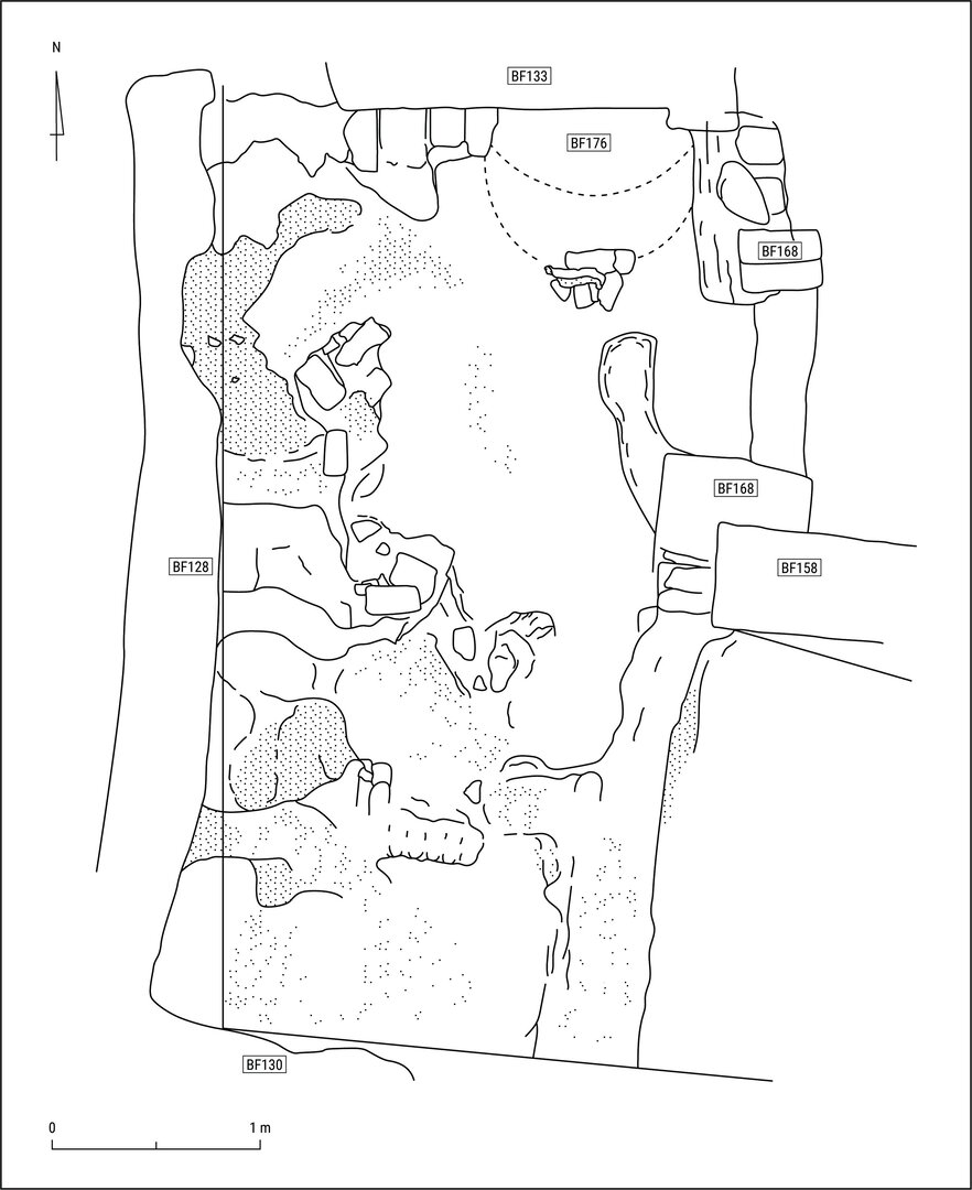 Room B14, located to the northeast of room B15, measures ca. 2.30 m from north to south by 2.70 m from east to west and has walls preserved to a maximum height of 1.97 m (south wall BF158). It was originally plastered in mud, traces of which are still visible. B14 is connected with B15 through a doorway (BF168; width of the opening: about 70 cm) set into the west wall. It consisted of a short north–south screen, abutting a protruding stub, to the north and a stub abutting wall BF158 to the south (located on top of relic wall BF212).77 Along the east side of the threshold, a mud-brick step was found below the higher of the two mud floor levels identified during the excavation.78 The narrow space between the north end of the doorway and a stub protruding from the west end of the north wall was filled with mud-bricks that were found in highly deteriorated condition. Archaeological investigation revealed that the oven originally located against the north wall of B15 also lay against the outer face of the west side of B14. The east wall is the oldest feature of the room, as the north and south walls, which supported an east–west oriented vault,79 abut it. In fact, the east boundary consists of two separate walls (BF167 to the north and BF169 to the south). The latter bears scanty remains of a vault (BF173) that was no longer in situ when B14 was built. The vaulted roof of room B14 seems to have collapsed, or to have been intentionally dismantled, soon after the complete abandonment of the room, as no traces of it were found inside.