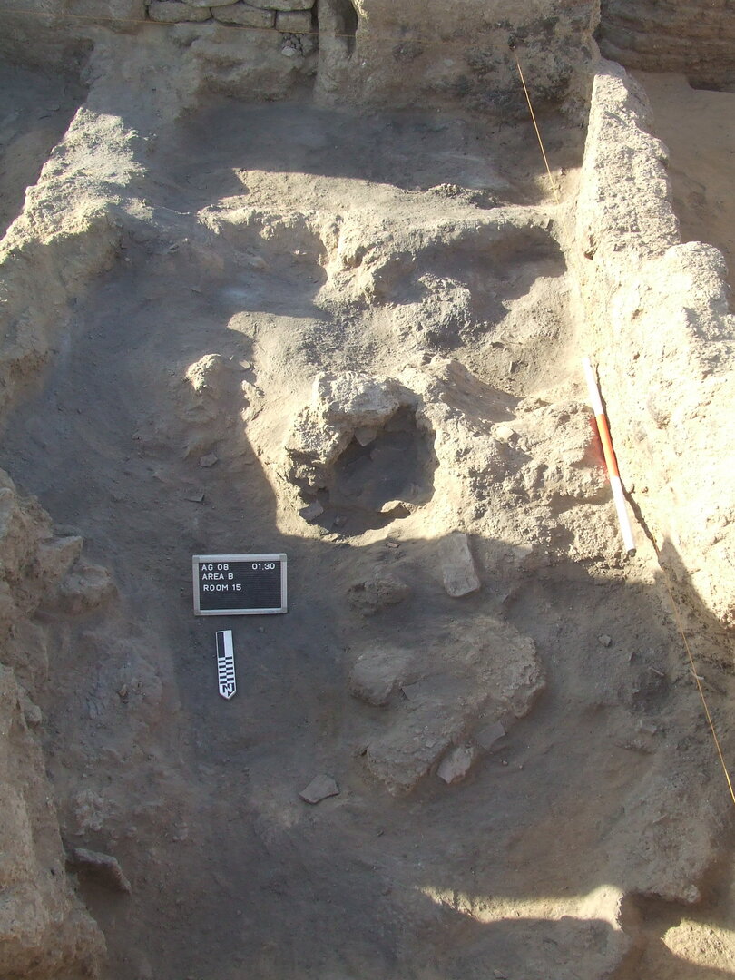 DSU129 rested in part above the remains of substructures, visible along the western and northern walls of the room, that once hosted clay ovens. A few traces of the original pot chambers were found scattered throughout this area. Within the remains of an oven placed against the north wall, the removal of a deposit of soft brown sand (DSU134)86, with a few pebbles and limited organic inclusions, revealed a lower layer of dark brown/grayish ash (DSU135)87, which contained pockets of soil of different colors (dark brown soil with organic inclusions; fine, light gray ash; reddish brown clay, likely debris from the oven). DSU129 was identified also in the southeastern part of room B15, beyond the mud-brick platform and thus in an area that seems to have differed, from a functional point of view, from the rest of room B15.