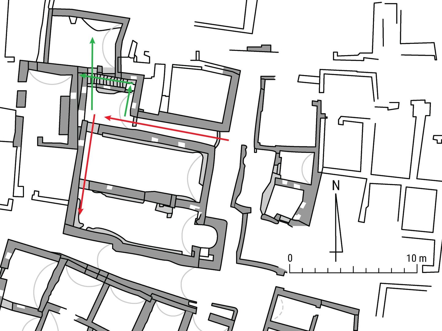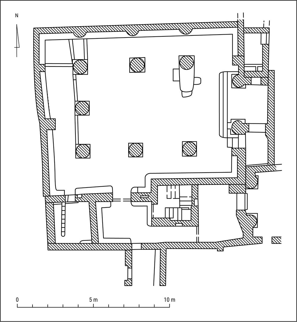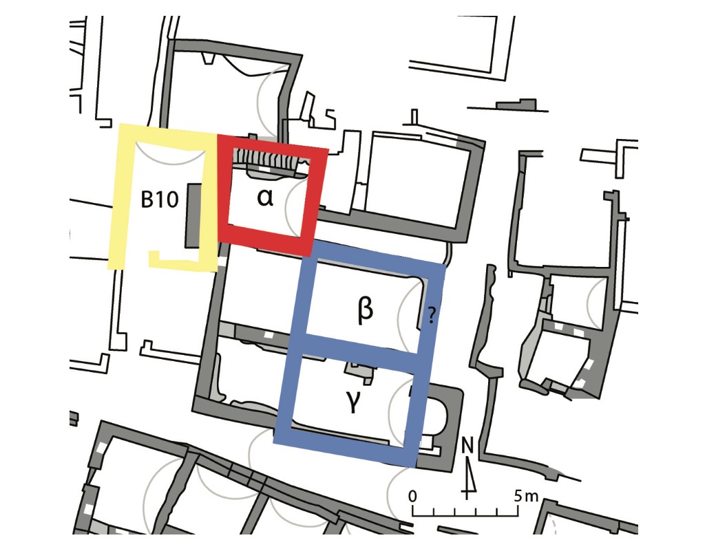 Access to the rooms at the northwest end of the church complex was, instead, regulated by minor axes, all starting from anteroom B6 and therefore secondary to the main east–west axis crossing corridor B7. One runs perpendicular to the latter, along the east wall of the anteroom, and crosses the doorway into staircase B8. From there, the staircase follows a line perpendicular to the preceding axis, leading to the roof of the complex and, in particular, to the small-scale industrial installations on the vaulted roof of kitchen B10. A third minor axis starts at the southwest corner of room B6, where the two main axes meet near the doorway into the gathering hall. It is oriented north–south and runs below the narrow vaulted passageway below the staircase, ending in pantry B9 at the northwest edge of the complex. This axis is, in fact, in line with the north–south one that leads from anteroom B6 to the church at the south end of the building, via room A46. Indeed, these two axes form one major pathway running from the north to the south end of the church complex, crossing three boundaries and four rooms plus the vaulted passageway below room B8. Therefore, it must have held a key role within the overall spatial configuration of the complex, shaping the movement of anyone entering the building.