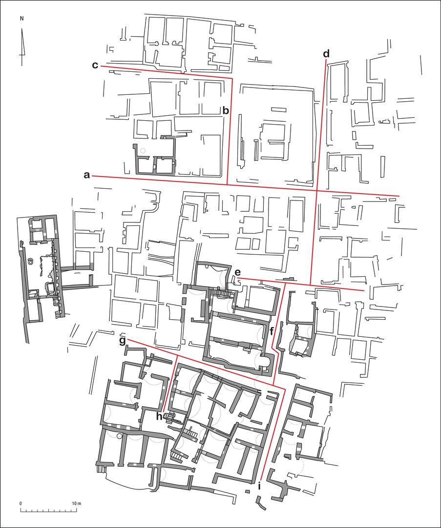 The available archaeological evidence allows us to identify a major axis crossing mound I from north to south, consisting of streets (d), (f), and (i), which are in fact segments, although slightly shifted from each other, of the same north–south oriented street. This axis is matched by another street running from east to west and crossing the former near the southeast corner of the pigeon-house, located in the north half of the hill. All other paths surveyed or excavated on mound I, that is to say, (b), (c), (e), (g), and (h), are connected, directly or indirectly, with the main north–south or east–west axes. They once channeled the flow of people in and from all edges to the mound and through its dense topographical layout.