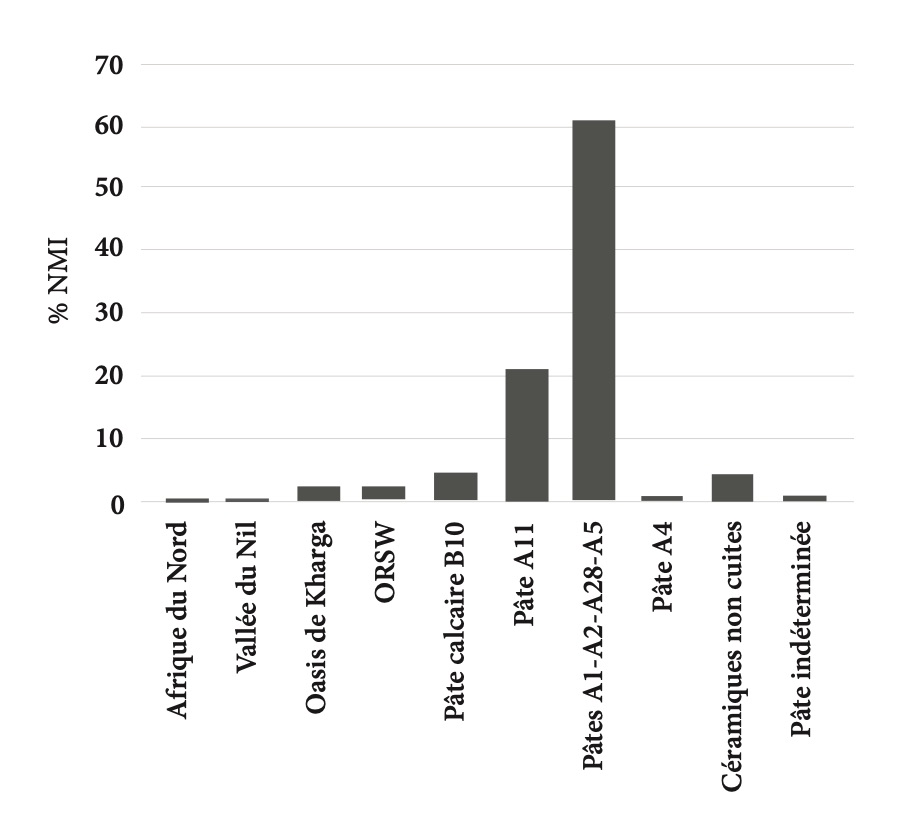 une importation d’Afrique du Nord (0,01 % du NMI par site); les importations de la vallée du Nil en pâte alluviale et en pâte calcaire (principalement des amphores, des vases à liquide et des récipients culinaires; 0,27 % du NMI par site); les importations supposées de l’oasis de Kharga (bols et amphores de table, groupe B16; 1,37 % du NMI par site); la vaisselle de table ou céramique qualifiée de fine et le luminaire à pâte rouge et engobe rouge, plus connus sous l’appellation d’Oasis Red Slip Wares originaires de l’oasis de Dakhla ou de Kharga (1,09 % du NMI par site); les céramiques en pâte calcaire (groupe B10) dont le lieu d’origine n’est pas défini; ce groupe recouvre principalement des gargoulettes (2,57 % du NMI par site); les céramiques en pâte réfractaires (groupe A11) qui comprennent principalement des récipients culinaires (marmites et casseroles) ainsi que des coupelles et des bols (24,64 % du NMI par site); la grande famille des céramiques supposées, en toute légitimité, originaires de l’oasis de Dakhla; il s’agit des groupes A1/A2, A28 et A5 (64,90 % du NMI par site); les céramiques d’usage domestique ou liées à des activités d’élevage d’animaux en pâte grossière A4 (dokkas, bassines, pithoi, mangeoires…; 0,42 % du NMI par site); enfin, la dernière partie sera consacrée aux céramiques non cuites produites localement, sur le site même d’ʿAin el-Gedida (3,9 % du NMI par site).