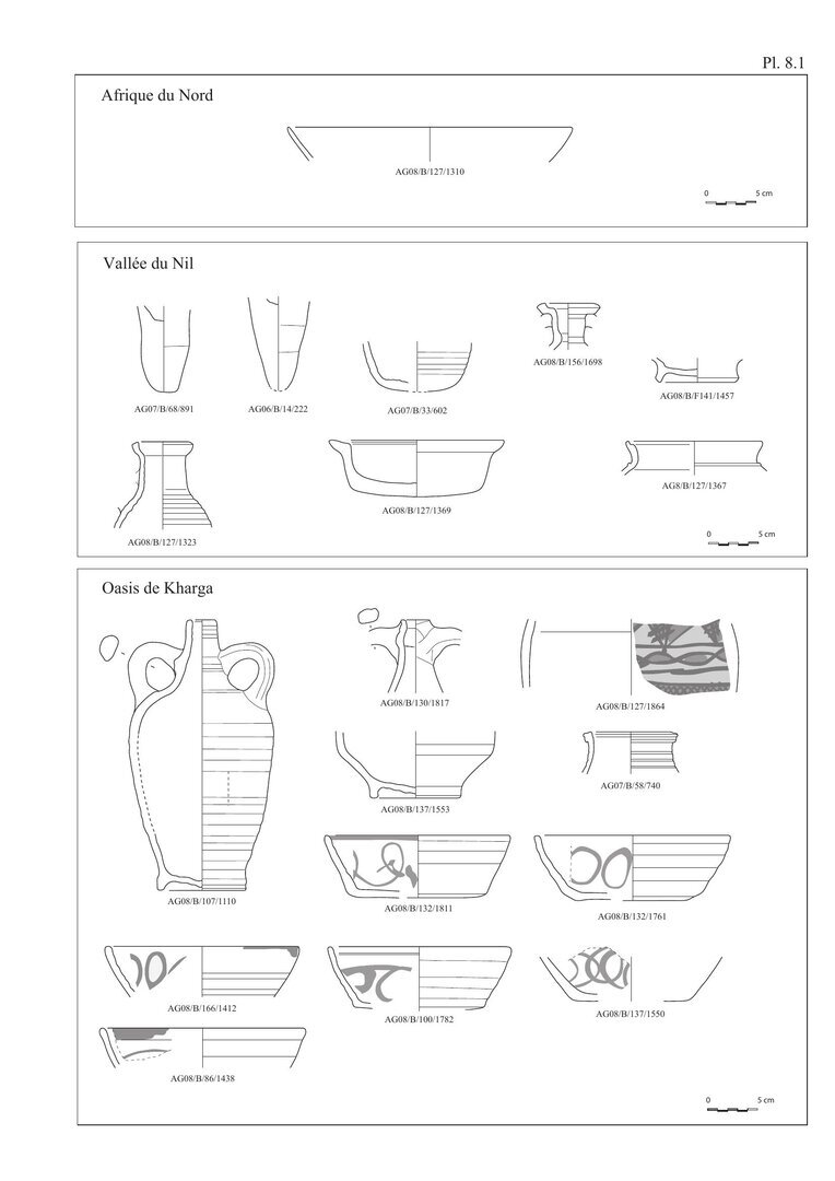 Les céramiques provenant des ateliers implantés le long de la Vallée du Nil se divisent en deux groupes principaux et distincts suivant la nature de la pâte (Plate 8.1). Le premier groupe concerne principalement les amphores LRA 7-AE 7 qui apparaissent vers le milieu du ive siècle ;20 ces dernières, peu représentées sur le site, possèdent une pâte alluviale ou siliceuse, généralement de couleur marron, de texture moyennement fine et renfermant principalement des particules végétales et des petits micas dorés (groupe A3b). Les amphores LRA 7 ont auparavant été reconnues sur quelques sites des oasis du désert occidental, ainsi à Amheida à partir du milieu du ive siècle,21 à Ismant el-Kharab/Kellis22 et à Kysis23 dans des niveaux de la fin du ive et du début du ve siècle. Ces amphores sont également attestées sur la route du Darb el-Ghubari, reliant les oasis de Dakhla et de Kharga.24