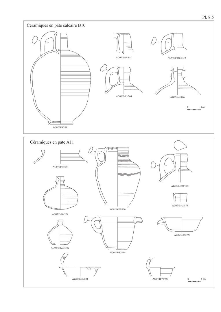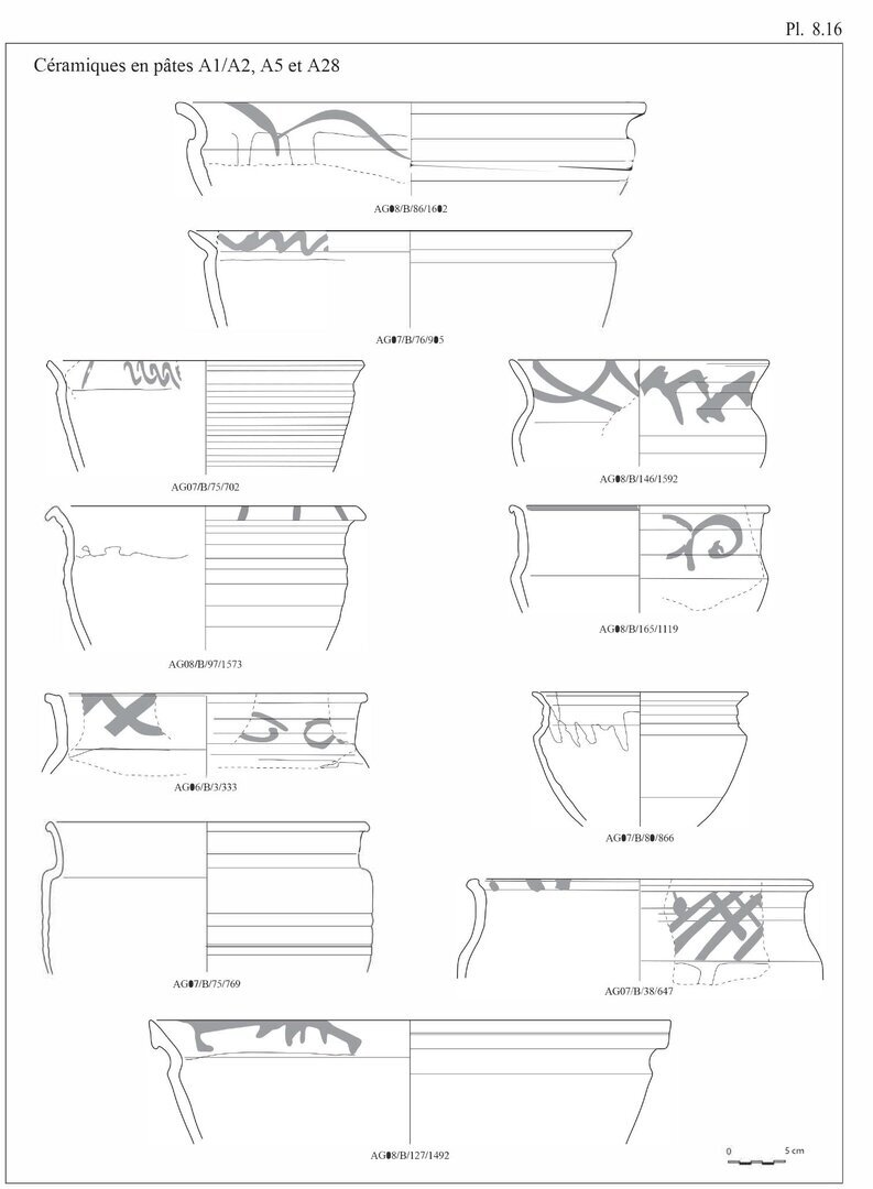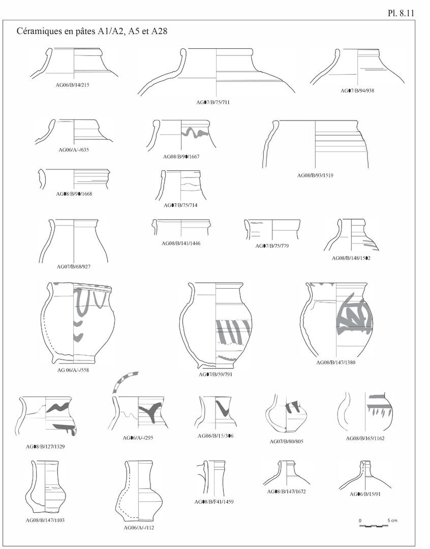Le répertoire morphologique lié à ce groupe comprend deux formes principales présentant généralement un décor peint.29 (Plate 8.1). La première forme est celle des amphores de table à panse cylindrique, fond annulaire et pourvues de deux anses; la panse est fréquemment ornée d’un riche décor peint sur un engobe jaune. La seconde forme est celle des écuelles à fond plat et parois obliques dont l’intérieur présente un décor d’entrelacs rouges également peint sur un engobe blanc à jaune. On signalera que les bouteilles étaient sans doute réservées au transport et au conditionnement de vin, ce dont pourraient témoigner les résidus de poix encore visibles sur les parois de certains exemplaires.