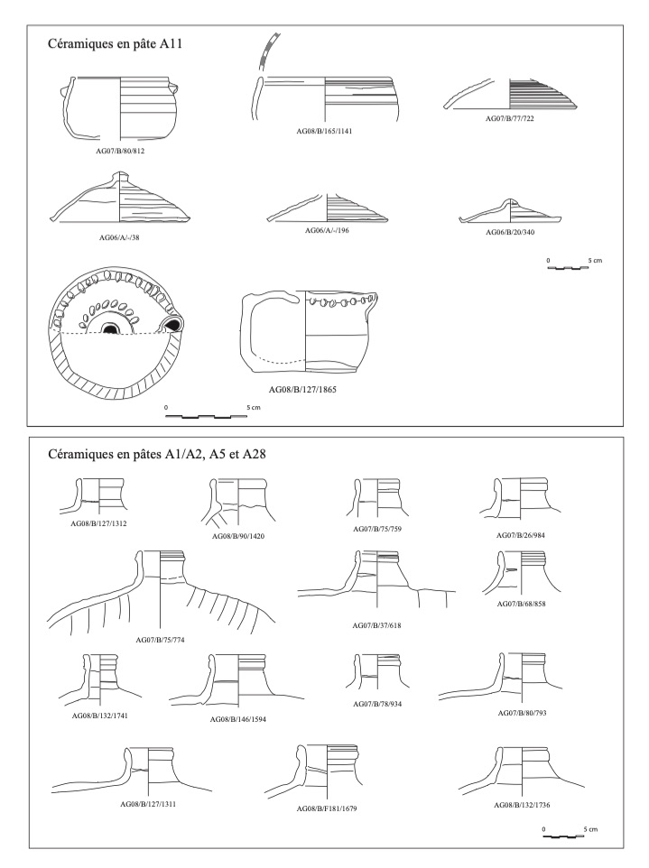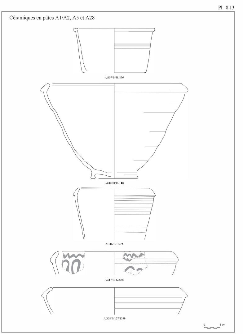 A3b: pâte alluviale, de texture moyennement fine et de cassure zonée: marron à rouge et cœur gris-bleu; les inclusions consistent en fines particules végétales et en grains de quartz de taille moyenne. Surface externe brune et lissée.