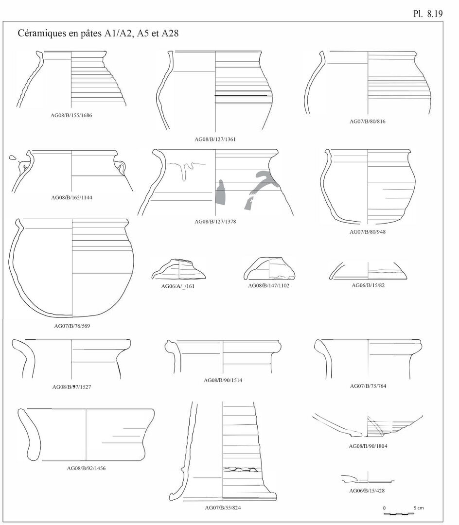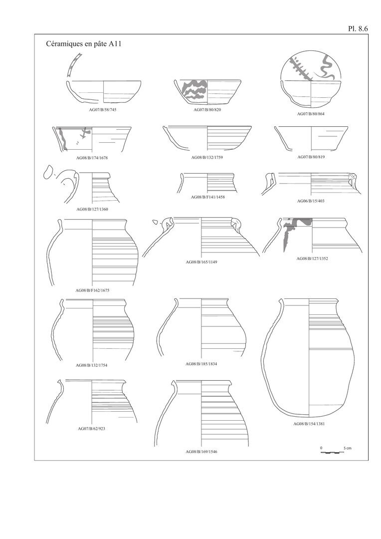 En ce qui concerne les bols en pâte A11, nous avons choisi d’indiquer 20 individus au lieu des 29 fonds. En effet, ces fonds peu caractéristiques peuvent également être associés aux pots globulaires, éventuellement aux casseroles.↩︎